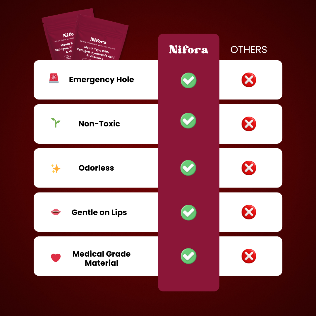 Sleeping with your mouth open can lead to dryness, dehydration, and that “cotton-mouth” feeling when you wake up. By encouraging lip closure and nose breathing, our tape helps maintain oral moisture, reduces dryness, and diminishes morning throat and mouth irritation — leaving you feeling fresher and more comfortable.